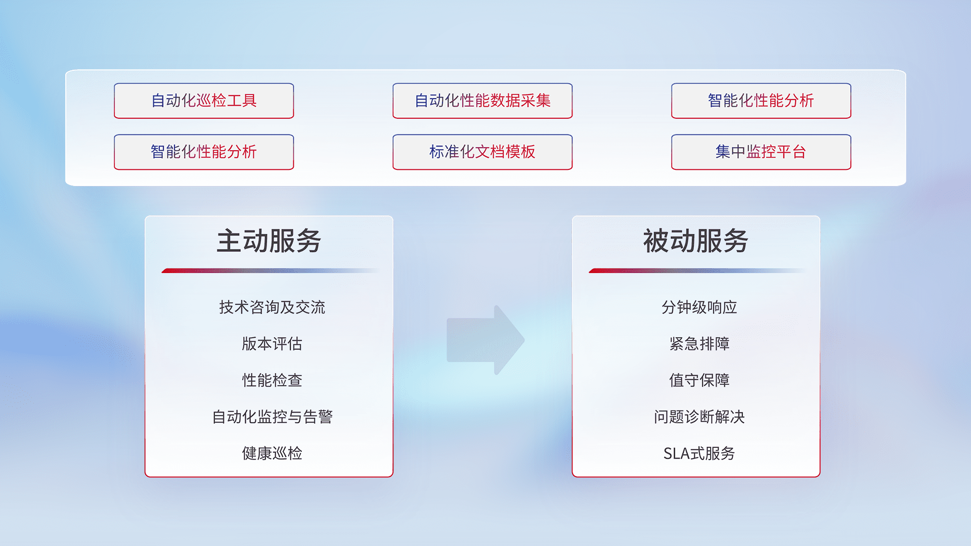 智能化工具和标准化文档,,保障服务质量,,,,提供主动服务(包含技术咨询、、、版本评估、、性能检查、、、、自动化监控与告警、、健康巡检)和被动服务包含(分钟级响应、、紧急排障、、值守保障、、、、问题诊断解决、、、SLA服务)。。。