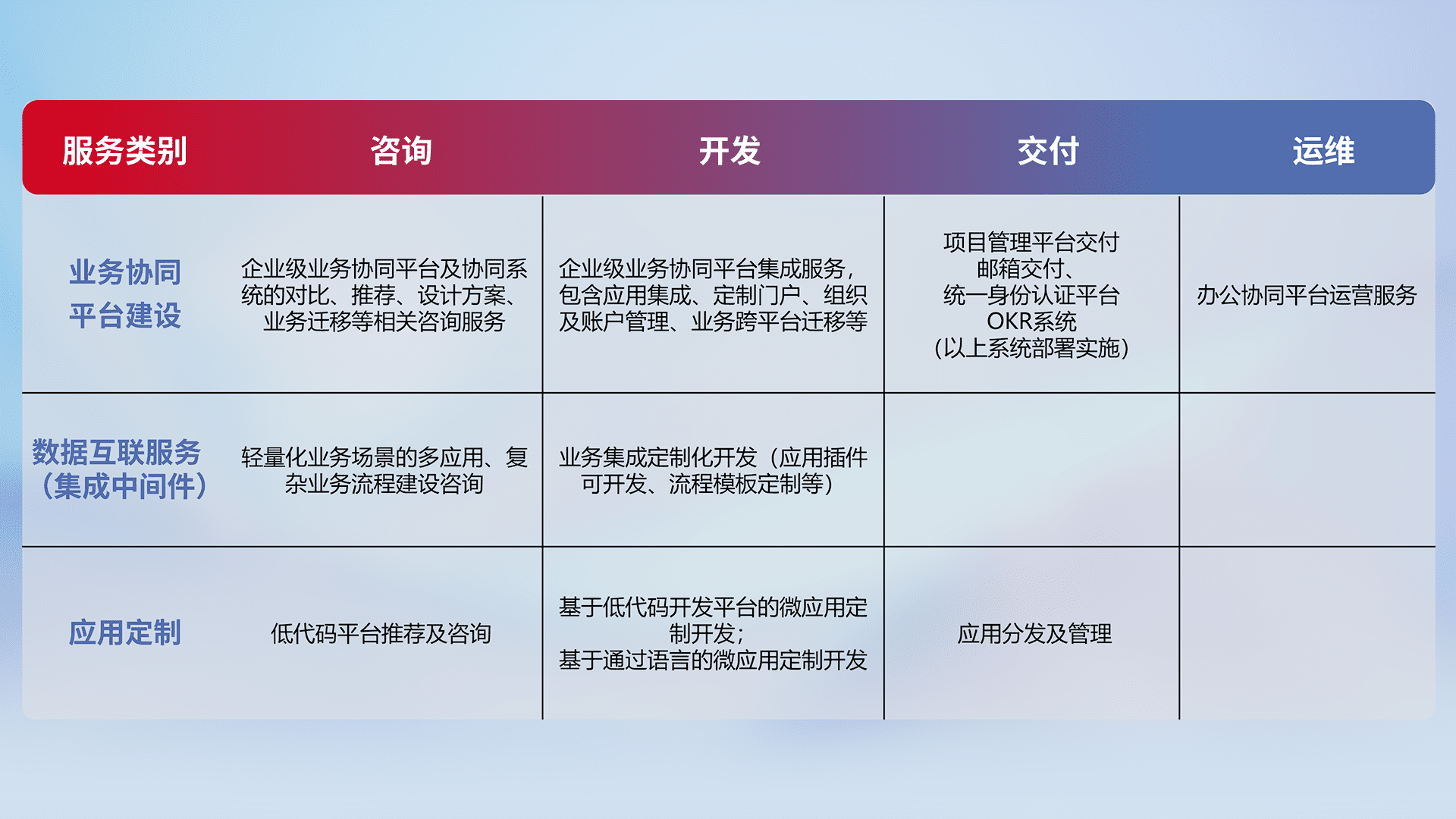 针对钉钉、、、企微、、、、IDaas等平台级产品提供产品的规划、、、、方案、、交付、、、、定制化开发等服务,,,实现如统一协同办公、、、智能客户服务、、、混合会议管理、、、、智能数据查询、、、、等业务场景,,实现数字化转型。。